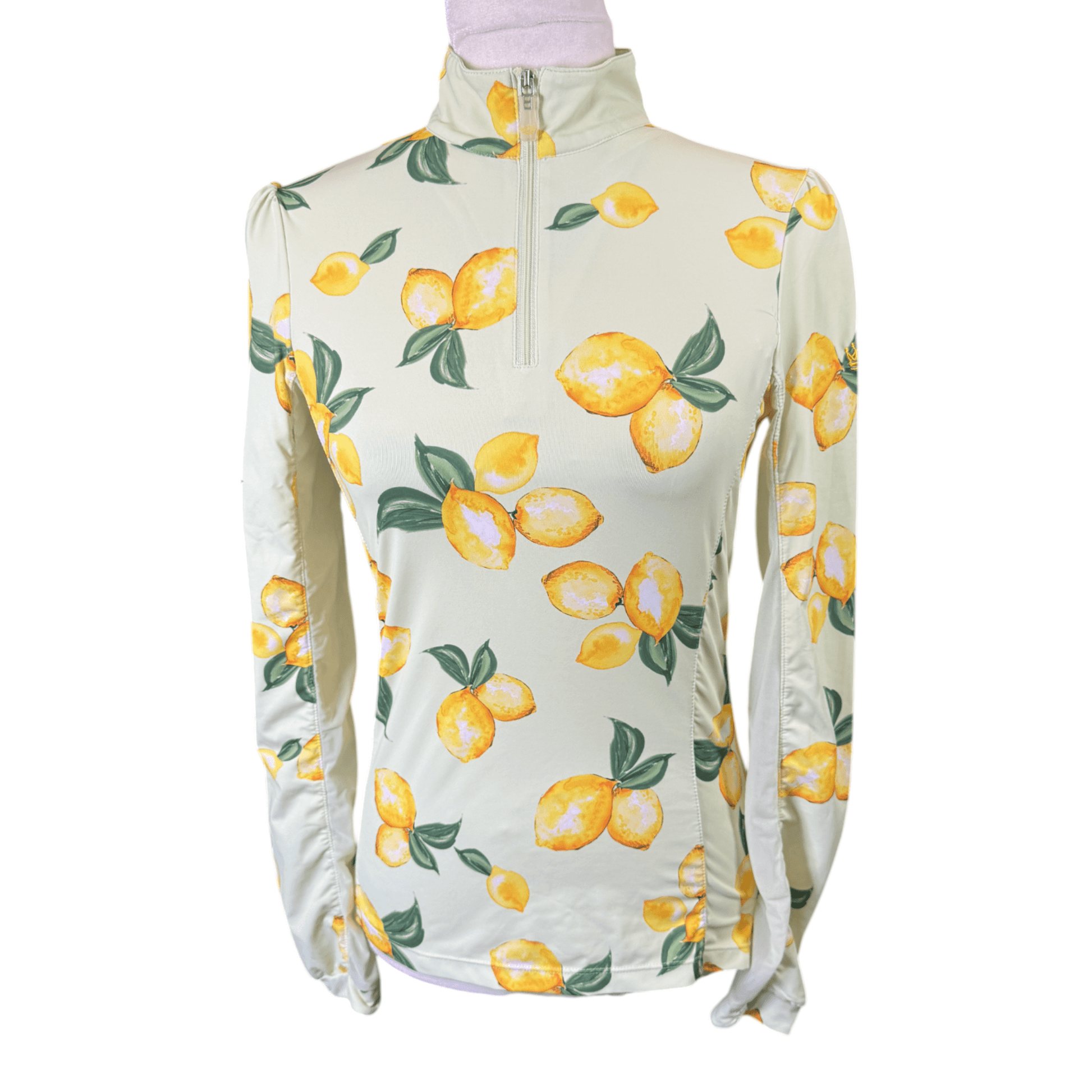 This season’s long sleeve silhouette with delicate shirring at the shoulders shines in our signature Capri lemon print. Soft 4-way stretch fabric, UPF 30 sun protection, ¼ zip neckline, flattering worn out or tucked in.