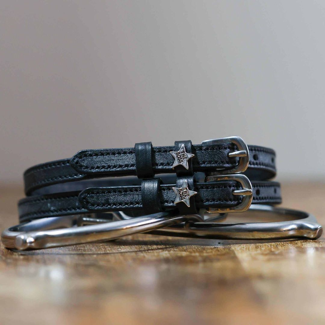 The Boss Star Silver Spur Straps from ManeJane bring together luxury, durability, and personality. Handcrafted from premium black leather with a non-stretch interior, these Spur Straps hold their shape ride after ride. Each pair features a stainless steel buckle, two keepers, and a custom ManeJane charm for a signature look. At 17 inches long, they fit smoothly through your spurs and stay secure. Elevate your tack with ManeJane Spur Straps—where form meets function in every ride.